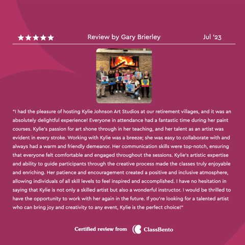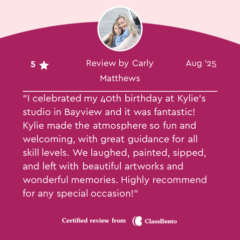 At Kylie Johnson Art, creativity meets connection and wellbeing through paint and sip events, art classes, and painting workshops across Sydney and the Northern Beaches. Enjoy a relaxing, mindful painting experience in the beautiful Bayview Boathouse Art Studio or as a mobile pop-up at your choice of venue in Sydney.