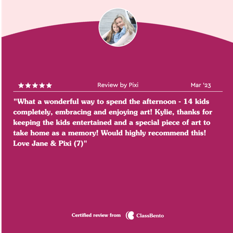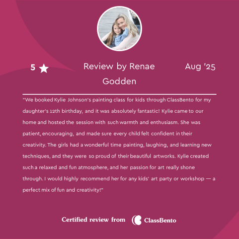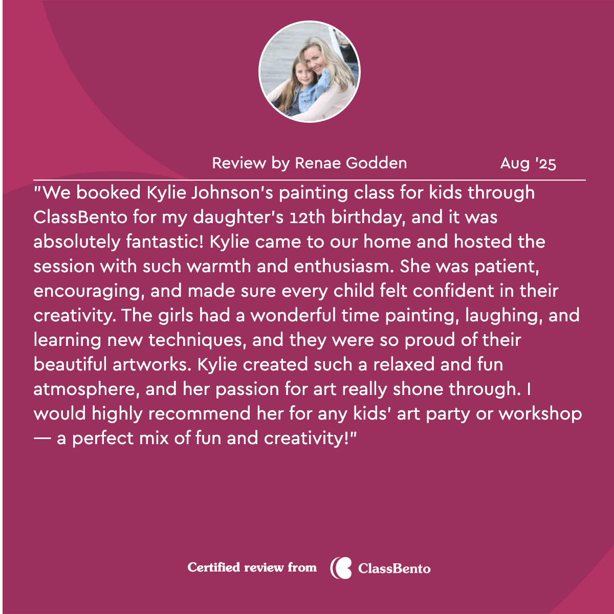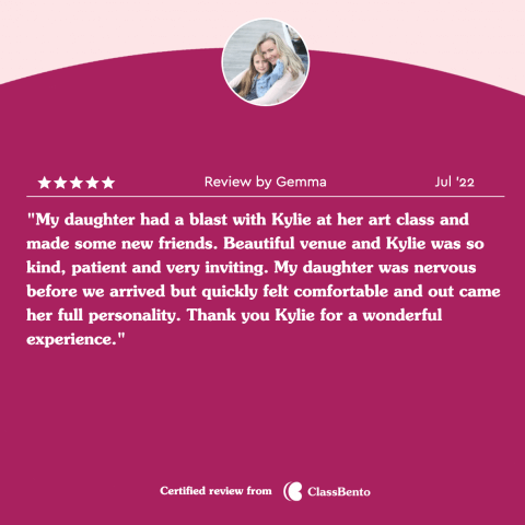 Her kids Paint and Singalong art classes, school holiday workshops, and term programs include learning new painting skills, nurturing confidence, creativity, and calm while providing a positive, screen-free outlet for children.